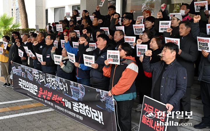 [한라일보] 국민의힘이 야당이 추진하는 윤석열 대통령 탄핵소추안에 반대하기로 당론을 정한 것을 두고 제주도내에서 규탄의 목소리가 커지고 있다.