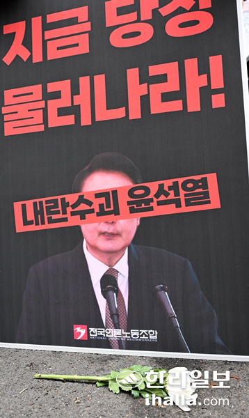 | 윤석열 대통령의 퇴진을 촉구하는 피켓 앞에 놓인 국화꽃. 강희만기자 |