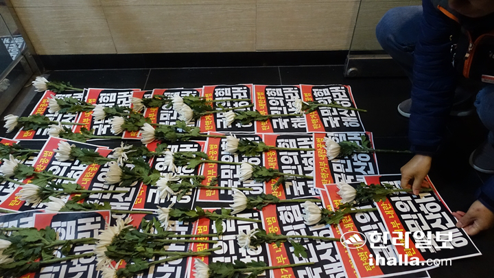 | 9일 윤석열 정권퇴진·한국사회대전환 제주행동 기자회견이 끝난 후 참가자들이 국민의힘 제주도당 당사 앞에 국민의힘 해산을 요구하는 팻말과 함께 국화꽃을 놓고 있다. |