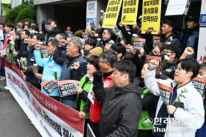 [한라일보] 윤석열 대통령 탄핵 표결 무산에 이어 한동훈 국민의힘 대표가 대국민 담화에서 질서있는 조기 퇴진을 언급하면서 제주시민사회단체가 헌정유린이라며 일제히 대통령 퇴진과 함께 국민의힘 해산을 촉구했다.
