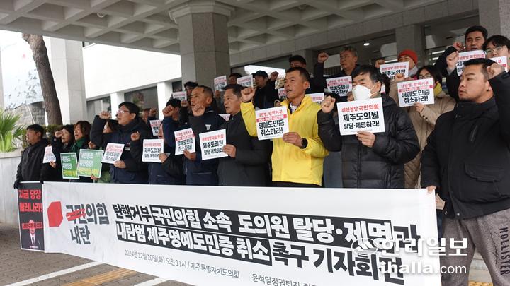 이어 "지방자치법 제98조와 제100조에 따라 지방의원이 '대한민국을 민주적으로 발전시키려는 목적'에 위배되는 행위를 하면 재적의원 3분의 2이상 찬성으로 제명할 수 있다"며 "제주도의회는 국민의 뜻을 배신하며 탄핵소추안 표결을 무산시키고 민주주의를 짓밟은 국민의힘 소속 도의원들을 헌법 정신에 따라 제명하라"고 강조했다.
