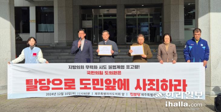 [한라일보] 윤석열 대통령이 촉발한 '비상계엄 사태'의 파장이 제주에서도 계속되고 있다. 제주도의회 내부에선 윤 대통령의 탄핵을 촉구하는 긴급 결의안 채택이 예고된 데 이어 진보당 제주도당은 국민의힘 도의원의 탈당을 촉구하고 나섰다.