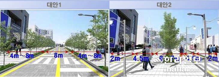 용역 결과 현행 20m의 도로 폭은 그대로 둔 채 차로를 왕복 4차로에서 2차로로 줄이고 보행로를 넓히는 2개의 기본 구상안이 도출됐다. 1안은 폭 8m의 2차로 양편에 4~8m의 보행로를 각각 확보하는 것이다. 2안은 도로 가운데 6~7m의 보행 녹지대를 배치하고 양편에 폭 4.5m 차로와 2m 보도를 각각 설치하는 구상을 제시했다.