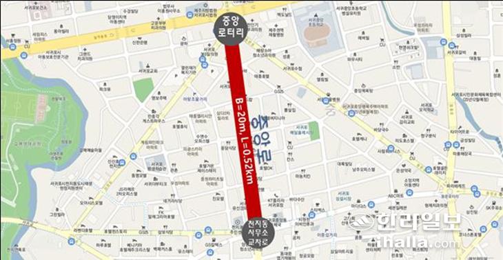 [한라일보] 제주 서귀포시 중앙로터리(일호광장)에서 천지동주민센터 교차로까지 차로를 줄이고 보도를 확장하는 보행자 중심 도로가 새롭게 탄생할지 관심이 모이고 있다. 기존 도로 폭은 유지하면서 왕복 4차로를 2차로로 줄이고 보행로를 대폭 늘리는 내용을 골자로 '서귀포형 웰니스거리 기본 구상 용역'이 최근 마무리되면서다.