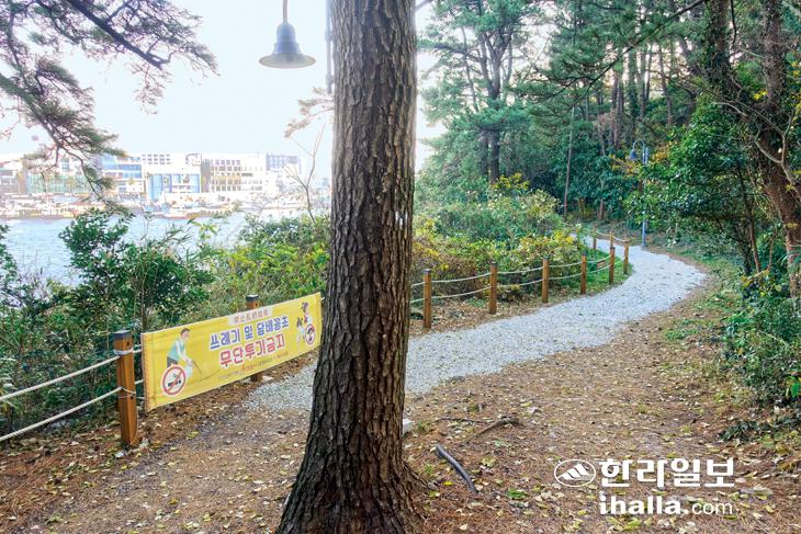 새섬 산책로에 담배꽁초 무단 투기 금지를 알리는 현수막이 걸려 있다. 진선희기자