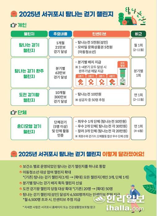 [한라일보] 제주 서귀포시는 내년에 주민참여예산 4억 원을 투입해 '탐나는 걷기' 챌린지 사업을 이어간다. 올해 걷기 실천율을 끌어올리는 데 현금성 탐나는전 포인트 등을 제공하는 챌린지가 효과를 거뒀다는 판단에서다.