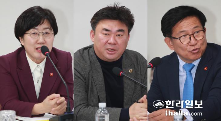 제주도의회 교육위원회 고의숙(왼쪽부터), 강충룡, 김경학 의원이 19일 제주도교육청으로부터 올해 주요 업무를 보고 받고 질의하고 있다. 제주도의회 제공