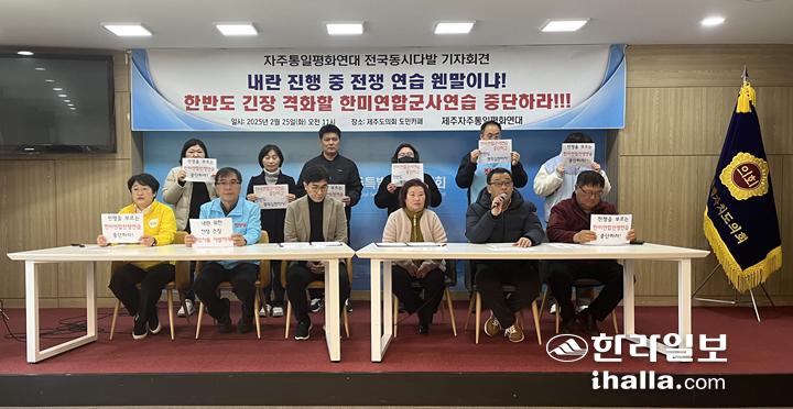 제주자주통일평화연대는 25일 제주도의회 도민카페에서 기자회견을 열고 "전쟁을 부르는 한미연합전쟁연습 자유의 방패(프리덤 실드)를 중단하라"고 요구했다.
