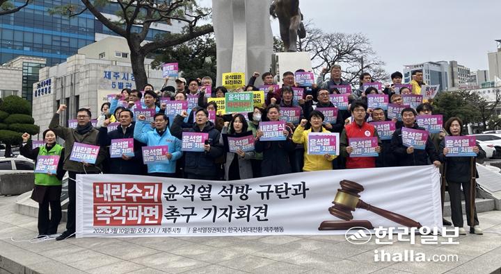 윤석열정권퇴진·한국사회대전환 제주행동은 10일 제주시청 앞에서 기자회견을 열고 윤석열 대통령의 파면을 촉구했다.