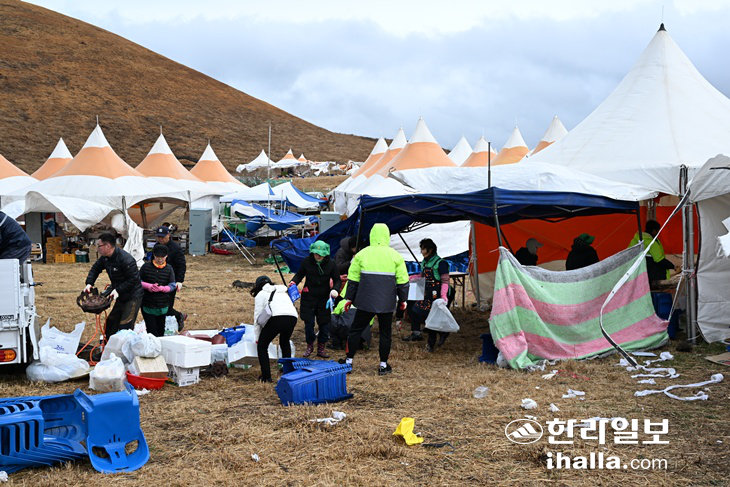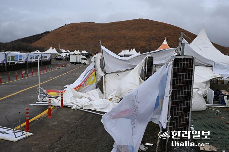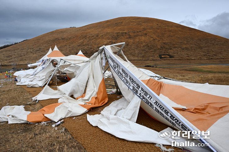 [한라일보] 제주에 강풍주의보가 발효 중인 가운데 제주들불축제장이 강풍 피해로 천막 여러 동이 무너지는 등 아수라장으로 변했다. 이에 주최 측인 제주시는 15~16일 행사 일정을 전면 취소했다.