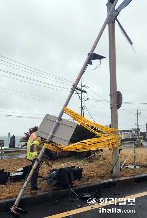 | 소방당국이 15일 쓰러진 신호등에 대한 안전조치에 나섰다. 제주소방안전본부 제공 |