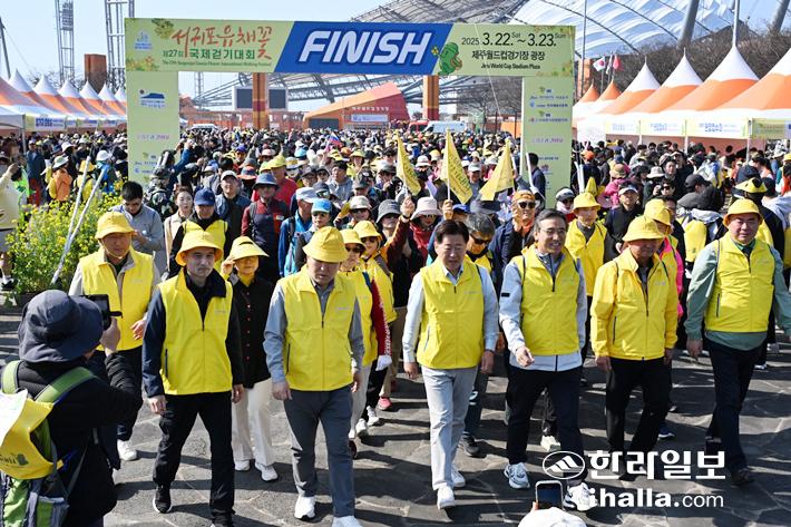 (사)서귀포시관광협의회가 주관하는 '제27회 서귀포 유채꽃 국제걷기대회'가 22일 제주월드컵경기장에서 개막해 23일까지 서귀포시 일원에서 열리고 있다. 강희만기자