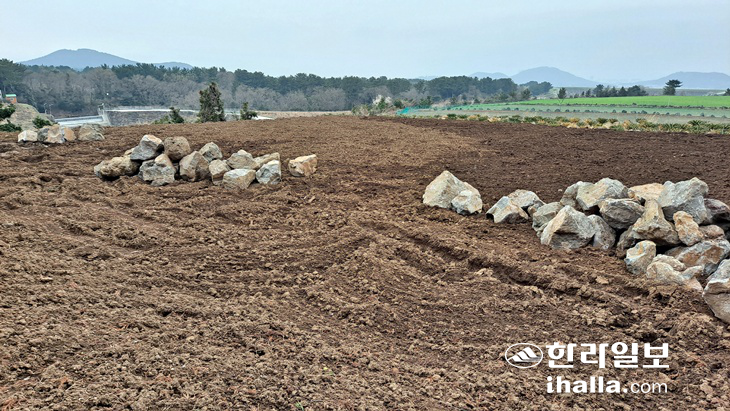 | 27일 현장을 확인한 결과, 제주시 오등동 소재 한 농경지가 제주시 오등봉공원 개발 사업장에서 나온 것으로 추정되는 토사로 성토돼 있다. |