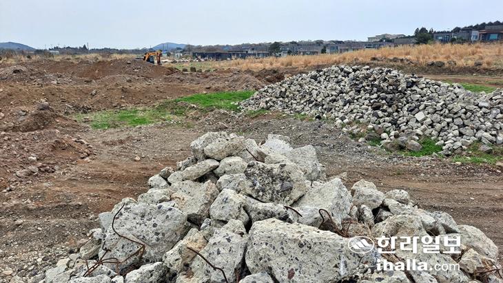 27일 현장을 확인한 결과, 공사현장(오라2동 제주아트센터 인근)에서 직선거리로 13㎞가량 떨어진 조천읍 와흘리 소재 한 임야에는 많은 양의 토사와 암석은 물론 개발 사업장에서 나온 철근 등이 포함된 건축폐기물과 폐아스콘 등이 4m 이상 높이로 2곳에 나눠 쌓여져 있었다. 일반 학교운동장 몇 배 크기의 현장에는 중장비인 굴삭기가 세워져 있어 최근까지 이곳으로 유입된 토사와 암석 등을 작업한 것으로 추정됐다. 인근 도로보다 낮은 계단식 임야로 매립을 통한 평탄화작업이 상당부분 이뤄졌다.