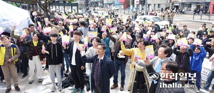 '윤석열정권퇴진·한국사회대전환 제주행동'주최로 제주시청 일대에서 열린 '윤석열 파면 제주도민대회'에는 주최 측 추산 300여명이 운집했다.