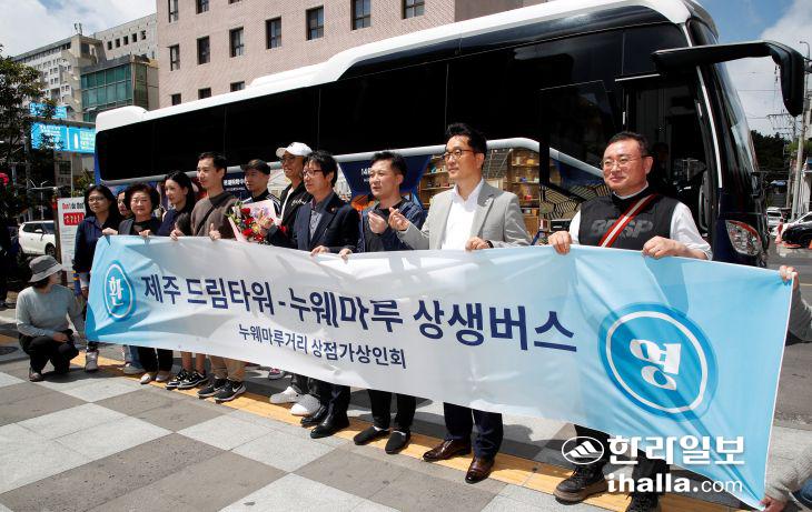 신제주 지역 상점가 활성화를 위해 제주 드림타워 복합리조트를 출발해 연동 누웨마루거리 입구를 순환하는 드림타워-누웨마루거리 상생버스가 28일부터 운행에 들어갔다. 강희만기자