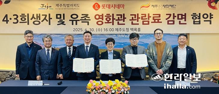 [한라일보] 5월부터 롯데시네마를 이용하는 제주4·3희생자와 유족들은 영화 관람료를 할인받는다. 제주도는 이런 내용으로 지난달 30일 도청 백록홀에서 롯데시네마, 제주4·3평화재단과 '4·3희생자 및 유족 영화 관람료 감면 사업' 업무 협약을 체결했다고 1일 밝혔다.