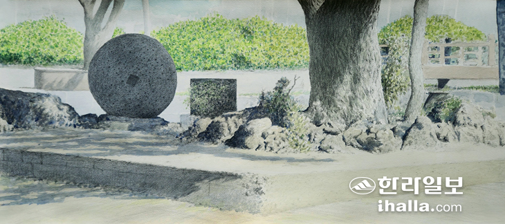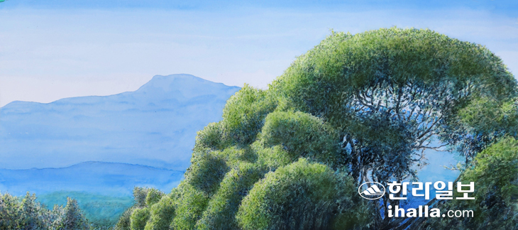 계절의 여왕이라고 이르는 것은 꽃보다 나무에 있음을 보여주려고 그렸다. 토산1리에서 바라보는 한라산의 권위와 품격은 오후 5시에도 그 강렬함을 잃지 않는 눈부신 햇살 품은 저 나무가 알고 있다. 마을회관 옥상에서 그린 것이다. 이 마을에서는 제주어로 신낭이라고 부른다. 표준어로는 참식나무. 3층 건물 높이보다 크다는 것은 옥상에서 한라산을 배경으로 그리려고 해도 윗부분 밖에 그리지 못했음을 그림이 구체적으로 설명하고. 산과 나무가 화면 속에서 일대일로 만났다. 한라산이 아무리 커도 멀리 있으면 줄어드는 것이 있고, 나무가 아무리 작아도 가까이 있으면 커가는 것이 있다. 화면 질량의 법칙은 그러하다. 저 나무에서 감동을 느끼게 된 것은 한라산 능선이 동쪽으로 뻗으며 달려가는 모습이 나무가 커서 나뭇가지 사이사이로 오버랩되듯 보이는 것이다. 나무가 산과 이런 방식으로 교감하는구나! 이 비옥한 토양을 가진 마을에서 가장 부각시키고 싶은 것은 옹골찬 저 초록 나무다. 한라산 정상까지 이어지는 시선의 흐름을 따라 펼쳐진 작은 능선들이 이곳의 위치를 설명하고 있다. 장엄하다.