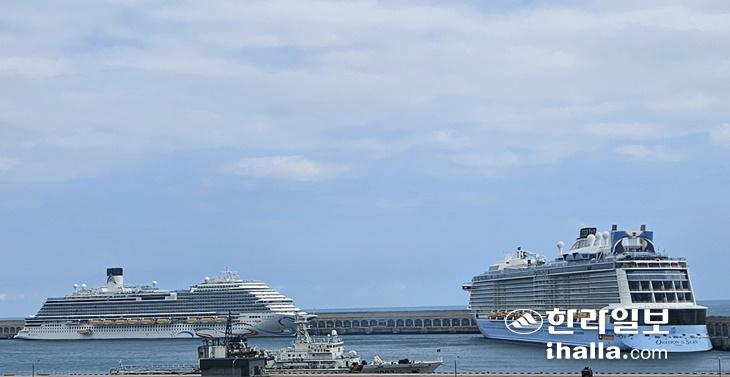 지난 10일 강정항에 입항한 오베이션 오브 더 씨호와 아도라 매직시티호. 제주도 제공