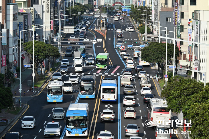 | 제주형 간설급행버스체계(BRT) 고급화 사업에 따라 지난 9일부터 제주시 서광로를 대상으로 섬식 정류장과 양문형 버스가 운행되면서 출퇴근길 극심한 혼잡이 발생하고 있다. 강희만기자 |