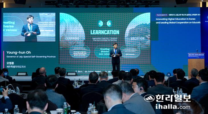 오영훈 지사는 기조연설을 맡아 교육과 지역 발전의 선순환 구조를 갖는 전략을 제시했다. 단계적으로 계절학기·인턴십·연구자 체류를 결합한 '런케이션' 플랫폼 구축, 하버드·미시간대 모델을 참고한 글로벌 석학 네트워크 공간인 '고등인재융합원' 조성에 이어 최종적으로 제주를 '글로벌 한국교육(K-교육)·연구 도시'로 발전시킨다는 구상이다.