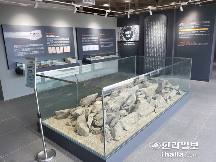 | 제주예비검속 백조일손역사관. 부서진 백조일손지지 비석 등이 전시되어 있다. 진선희기자 |