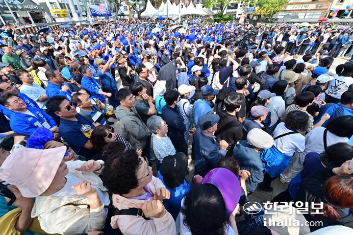 22일 제주시 일도동에서 진행된 더불어민주당 이재명 후보 유세. 강희만기자