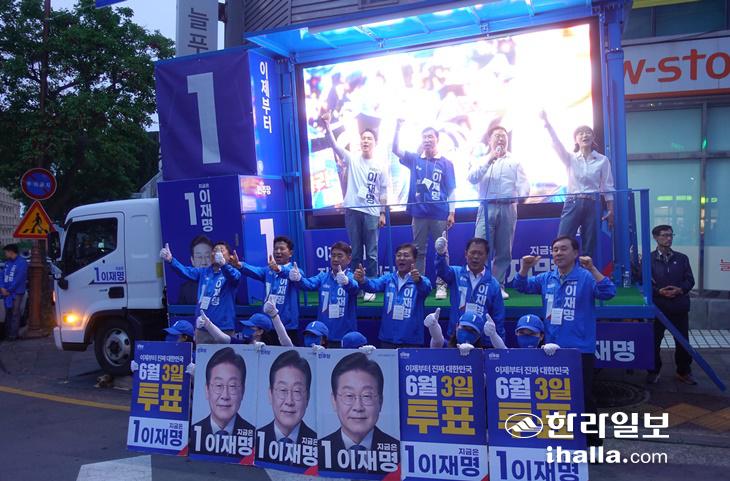 더불어민주당 제주선대위가 지난달 31일 저녁 서귀포시 초원빌딩 앞에서 총력 유세를 펼치고 있다. 진선희기자