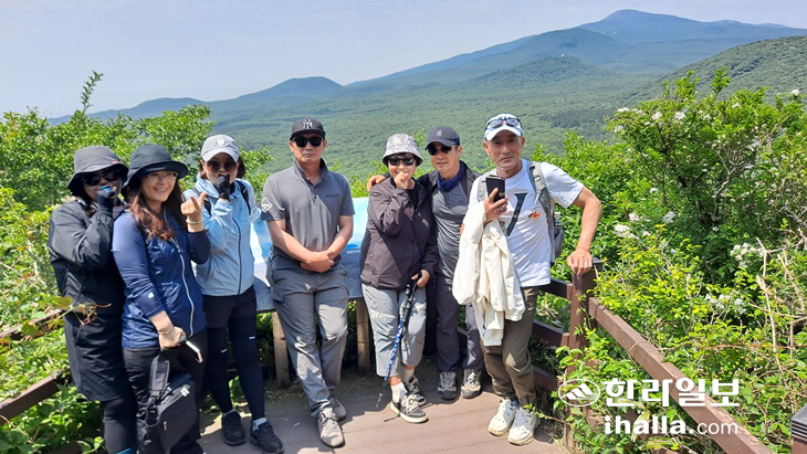 | 물찻오름 탐방에 나선 '제주 오름 그리고 올레 산악회' 일행이 전망대에서 한라산을 배경으로 기념 사진을 촬영하고 있다. |