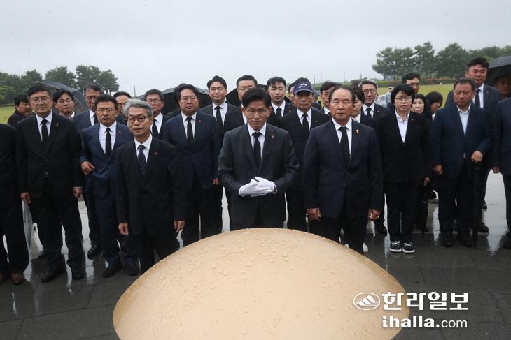 2일 국민의힘 김문수 대선 후보가 국민의힘 제주선대위 관계자 등과 4·3평화공원을 방문해 참배하고 있다. 제주도사진기자회
