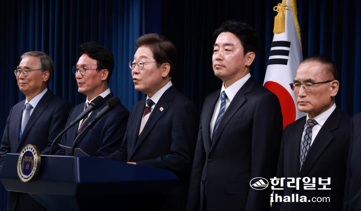 이재명 대통령이 4일 서울 용산 대통령실 청사에서 열린 새 정부 첫 인사 발표를 하고 있다. 왼쪽부터 이종석 국가정보원장 후보자, 김민석 국무총리 후보자, 이 대통령, 강훈식 대통령비서실장, 위성락 안보실장. 연합뉴스.