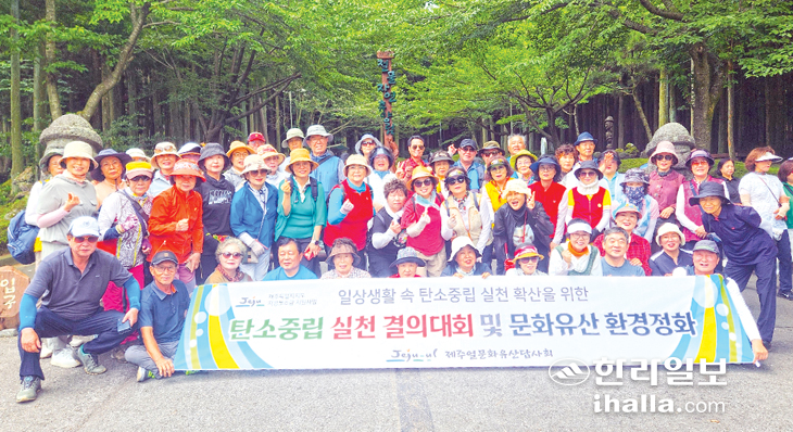 제주얼문화유산답사회(회장 김명석)는 지난 27일 제주시 절물휴양림에서 회원 80여 명이 참석한 가운데, 탄소중립 실천 결의대회 및 문화유산 환경보전 캠페인을 실시했다.