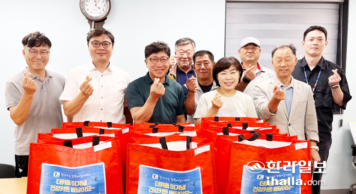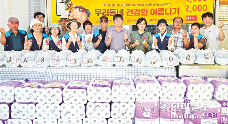 제주시 봉개동지역사회보장협의체(공동위원장 홍원기·김형준)는 지난달 29일 중복을 맞아 지역 내 홀로사는 어르신 50가구를 방문해 삼계탕과 화장지를 전달하는 나눔 활동을 벌였다.