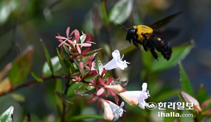 [한라일보] 7일 제주시 애월읍 한 가정집 정원에 호박벌이 찾아와 꽃댕강나무꽃 꿀을 따먹고 있다. 강희만기자