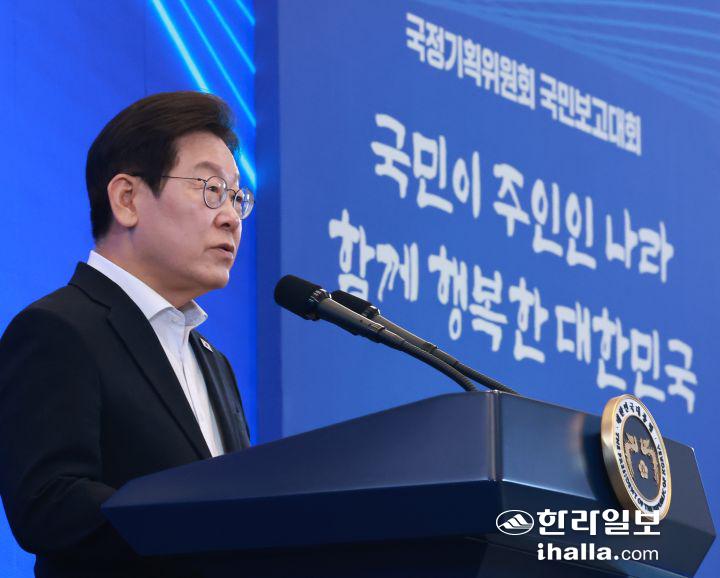 이재명 대통령이 13일 청와대 영빈관에서 열린 국정기획위원회 국민보고대회에서 발언하고 있다. 연합뉴스