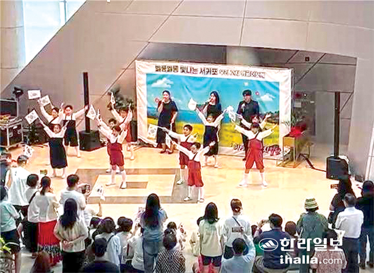 피어나리 다함께돌봄센터 아동들은 지난 14일 제80주년 광복절을 기념해 서귀포 공무원연금공단 로비에서 성악가 4명, 발레리나 1명과 함께 광복절 기념 뮤지컬 버스킹 공연을 진행했다.