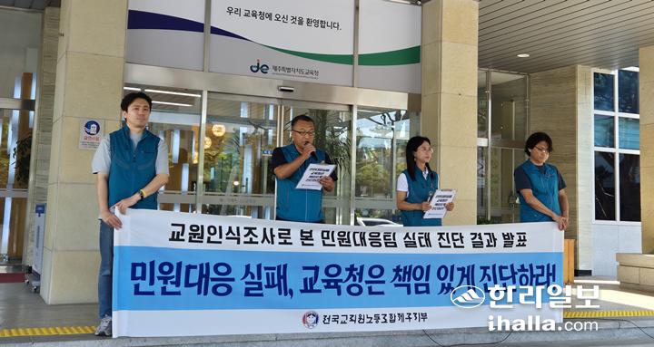 전교조 제주지부는 26일 제주도교육청 앞에서 기자회견을 열고 "민원 대응 시스템 작동 실패에 대한 책임 있는 진단과 원인을 공개하라"면서 "교사 권리 보장을 위한 체계적 지원을 강화하라"고 촉구했다.