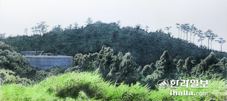 여름날 오후의 눈부신 햇살이 오름의 실루엣을 강조하기 시작하면 오름의 동쪽에 펼쳐진 나무들이며 풀잎들의 존재는 더욱 부각된다. 자연광선이 발생시키는 깊이와 공간감을 이 시기의 뜨거운 기온과 부합되게 그리고자 한 것이다. 짙거나 연한 빛깔들을 만드는 것은 그 식물의 본연의 것일 수도 있으나 광선의 영향과 배경이라고 하는 공간과 견주어져서 도드라지는 경우가 있다. 이 상황은 명료하게 3단계다. 바탕이 되는 원경의 천아오름과 중경이라고 할 수 있는 삼나무 종류의 배열, 그 나무를 배경으로 가까운 곳에서 싱그럽게 춤추는 연두색 풀잎들이다.