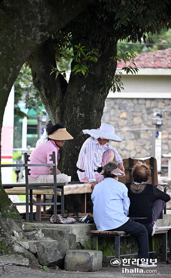 [한라일보] 폭염날씨가 계속 이어진 28일 서귀포시 표선면 성읍민속마을 어르신들이 나무 그늘에서 담소를 나누며 더위를 식히고 있다. 강희만기자