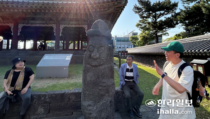 | 제주목 관아 관덕정 앞에서 제주 역사에 대해 교육 중인 왕준호 대표. 왕준호 대표 제공 |