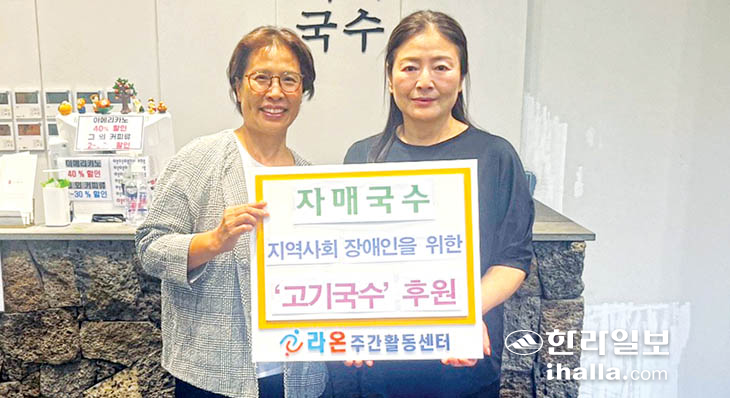 자매국수(대표 문애순)는 2일 라온주간활동센터(센터장 김명열)에 고기국수를 후원했다. 자매국수는 매월 발달장애인들을 위해 고기국수를 후원하고 있다.