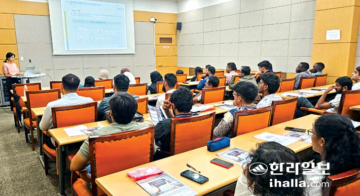 교육은 학생들의 이해도를 높이기 위해 언어권 별로 교육장을 3개로 나눠 제주대학교의 통역지원을 받아 동시통역 방식으로 진행됐다.