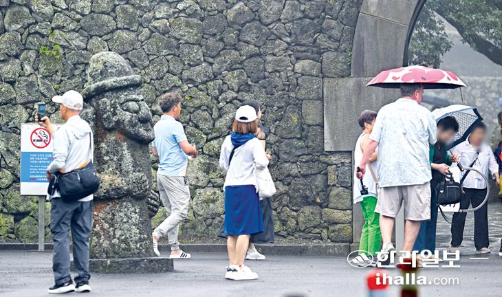 [한라일보] 10일 제주시 조천읍 산굼부리를 찾은 관광객들이 탐방에 나서고 있다. 강희만기자