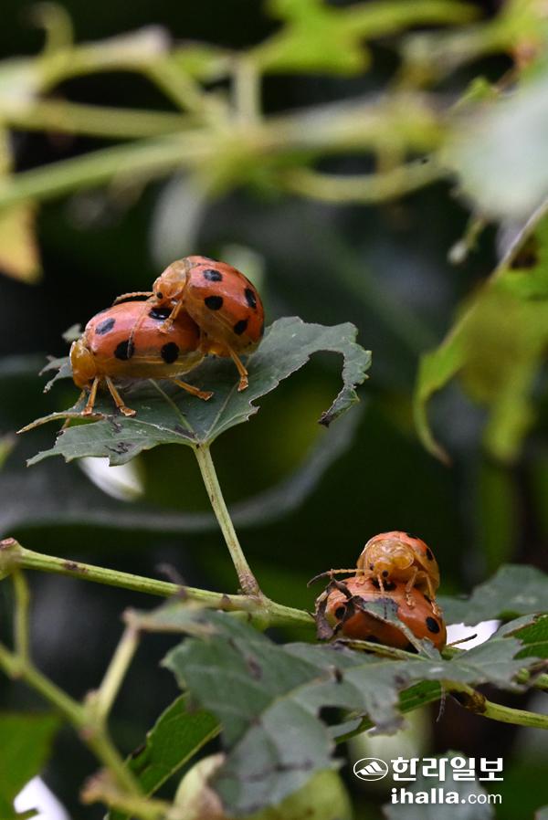 [한라일보] 24일 서귀포시 성산읍 수산리 일대에서 아열대성 벌레인 열점박이벌레가 종번식을 위해 짝짓기를 하고 있다. 강희만기자
