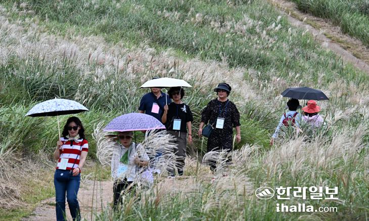 [한라일보] 25일 제주시 애월읍 봉성리 새별오름 탐방로에 억새꽃이 만개해 제주 가을의 정취를 알려주고 있다. 강희만기자