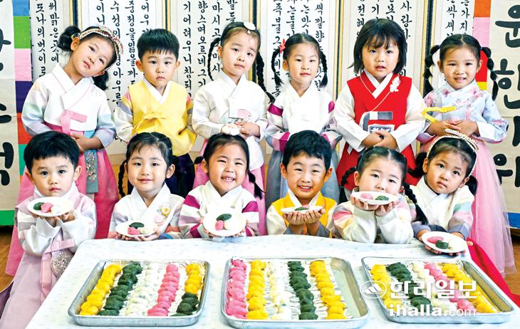 [한라일보] 추석을 닷새 앞둔 1일 한복을 곱게 차려입은 제주시 키즈빌어린이집 원아들이 고사리손으로 빚은 송편을 보여주고 있다. 강희만기자
