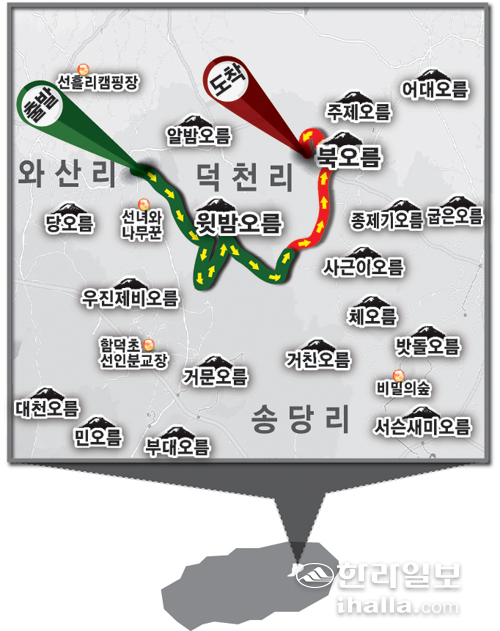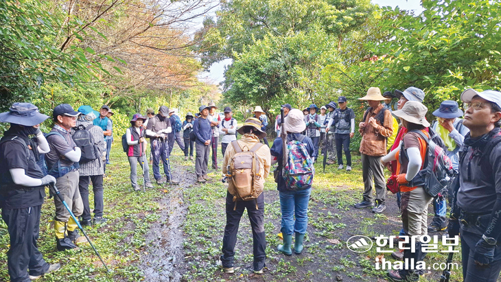 탐방 초입에서 에코투어 프로그램을 주관하는 제주자연환경해설사협회 고정식 회장이 안전하고 즐거운 탐방을 격려하러 나왔다. 서로 인사를 나누고 오늘의 안내자 김상연 해설사가 안내를 시작했다. 오늘의 안내자는 이곳의 지리를 잘 아는 여성 해설사다. 그녀의 눈빛과 태도에서는 굳센 의지와 깊은 신념을 느낄 수 있었다. 그녀는 이 마을의 설 촌 유래와 사람들의 삶에 대한 이야기를 들려줬다.