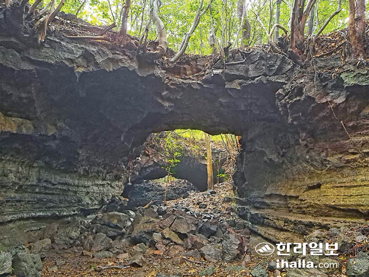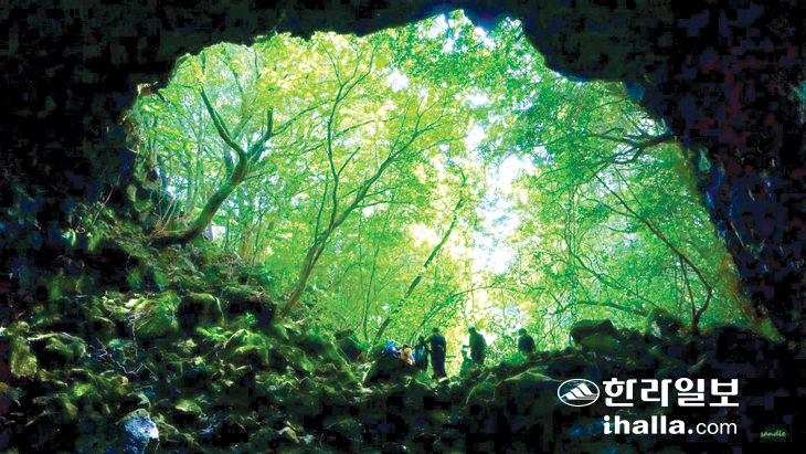 안내자는 용암이 발원지와 유네스코 세계자연유산에 등재된 조건들을 강한 어조로 설명했다. 만년 전의 그 당시를 상상한다. 검은 오름에서 붉은 불기둥이 무너져 강물처럼 흐르며 여러 개의 동굴, 곶자왈을 만들며 김녕 만장굴이 있는 마을 해안까지 흘러가는 모습을. 우리는 동굴 위를 걷고 또 걸으며 여기에 서 있다. 가히 신이 주신 선물이다.