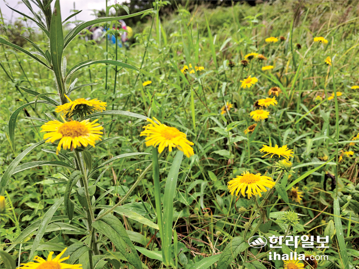 가늘어진 비 틈새에 안내자가 점심시간을 알린다. 변덕스러운 날씨에 도시락을 펼쳐놓고 그때 누군가가 장난스럽게 "오늘은 호랑이가 장가가는 날인가, 아니면 여우가 시집가는 날인가?"라고 말했다. 순간 모두의 시선이 그 말에 쏠리더니, 이내 한바탕 웃음바다가 됐다. 그 웃음 속에는 피로와 긴장이 함께 녹아내렸고, 자연 속에서 함께하는 소소한 즐거움이 더 깊이 느껴졌다. 빗방울이 흩뿌리는 소리와 어우러져 평범한 점심시간이 특별한 추억으로 남았다. 짐을 제 정비하고 주어진 점심시간을 끝으로 웃산전 못을 향해 발길을 옮겼다. 걸으며 몽쿨랑굴 이름이 의미가 궁금해졌다. "굴 주변에 구실잣밤 나무가 많이 서식하는데 그 열매가 동글동글해서 붙여졌다"고 경력자인 정희준 해설사가 자세히 설명했다. 아! 이름도 제주스럽다. 감탄하며 걷는 산전 들판은 노란 금불초가 만개하고 작은 들꽃들이 키 맞춤한다. 더워도 분명 가을은 오고 있었다.