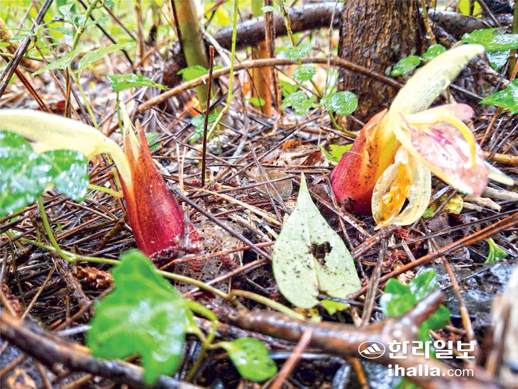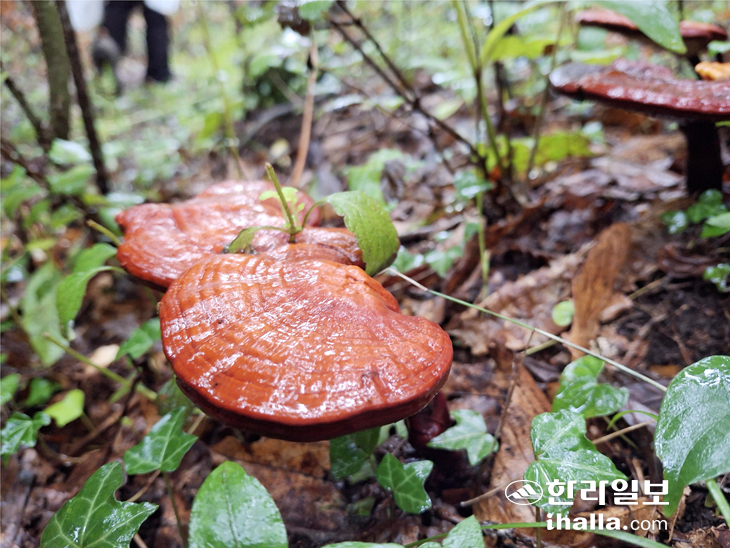 삼나무 숲길로 들어서는데 비가 온 뒤 위의 숲은 청량하고 산소창고 같았다. 가을의 전령사 극동귀뚜라미소리가 귀를 호강 하게 한다. 낮은 나뭇가지에 걸린 직박구리 둥지가 육추의 시기를 끝낸 듯 비와 바람에 헐거워진 모습이다. 삼나무 밑은 음지라 다른식물이 잘 자라지 못하는데도 불로초인 영지를 비롯해 노린재동충하초와 양하 순이 수줍은 듯 잎 사이로 고개를 내민다.